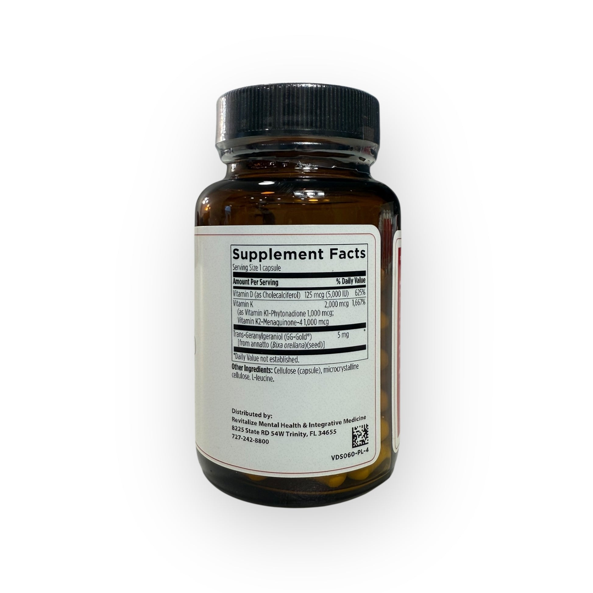 Revitalize Vitamin D provides clinically useful amounts of vitamin D3 and vitamin K (both K1 and K2 [as MK-4]), along with geranylgeraniol (GG), a substance produced naturally in the body, to promote optimal bone and arterial health and to maintain the immune system in proper balance. The amount of vitamins D and K in this formula may be beneficial for those who do not receive adequate sun exposure and/or dietary sources of these vitamins. Vitamins D and K work synergistically, thus, increasing vitamin D increases the need for vitamin K.